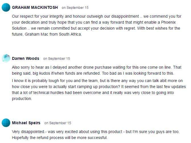 Past failed projects such as Zano and Pocket Drone utilised extensive backer funds through the course of their project, this resulted in minimal funds being available for refund following failure of the respective projects.
